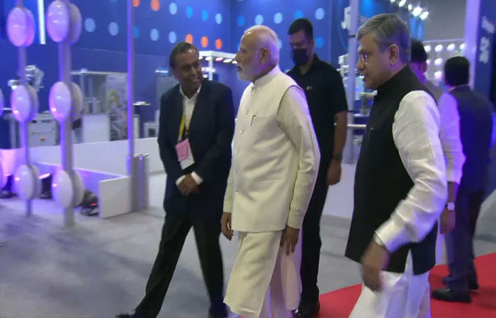 The Prime Minister got hands-on experience wearing 'Jio Glass' and a team of young Jio engineers briefed him on the indigenous development of end-to-end 5G technology.